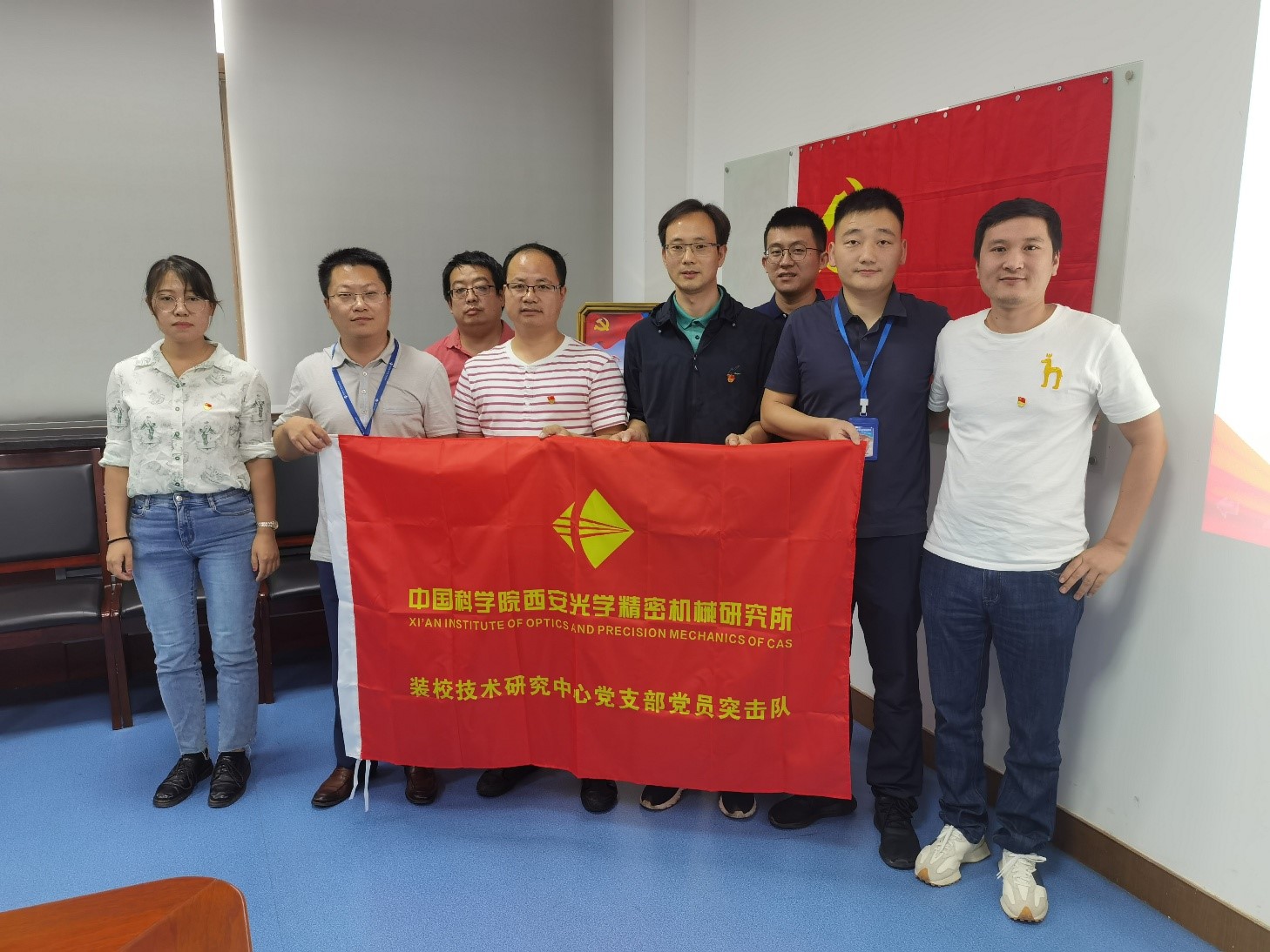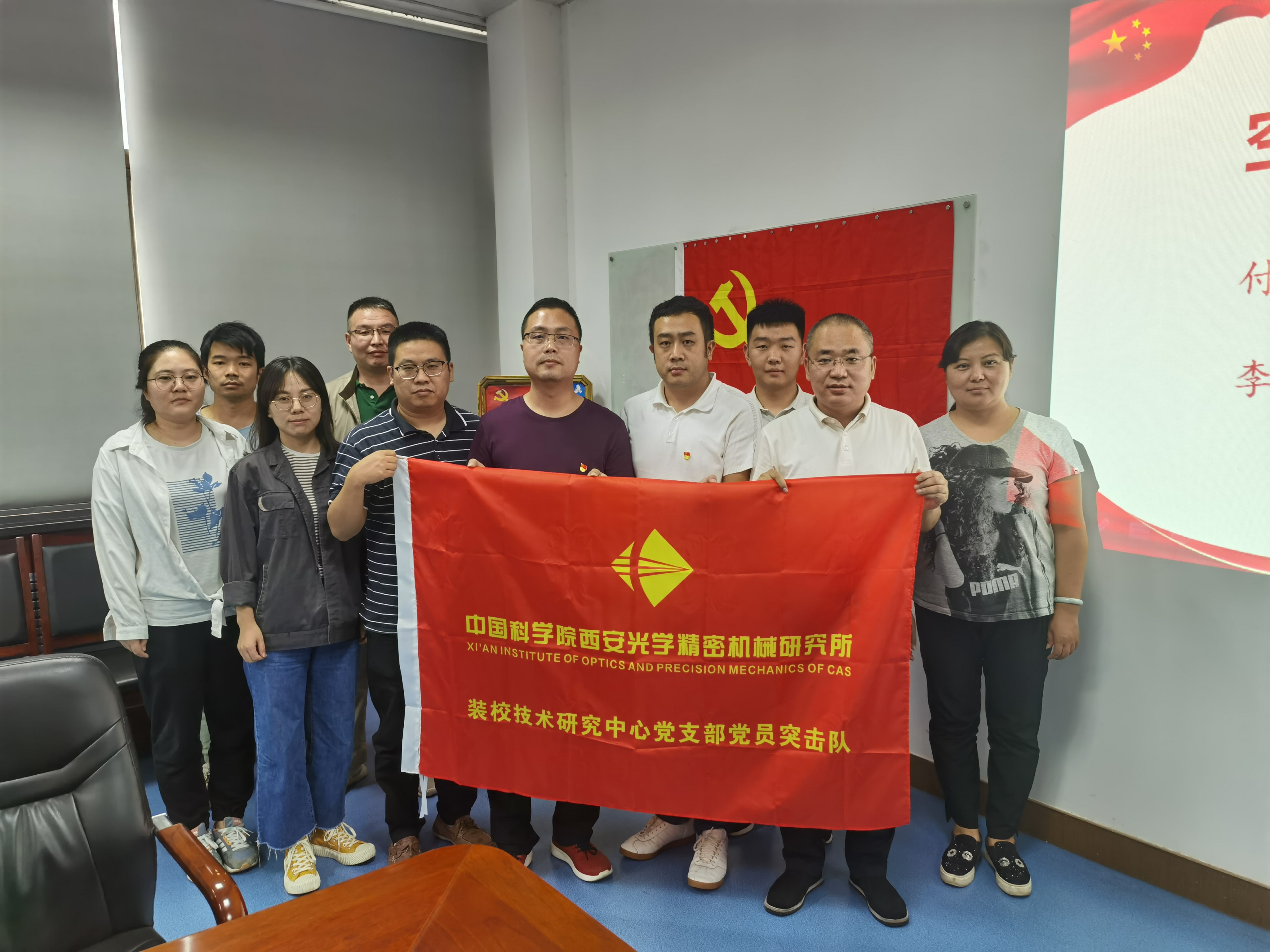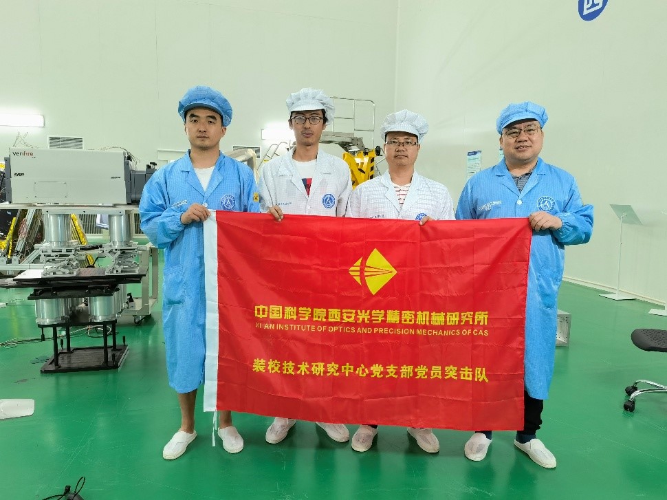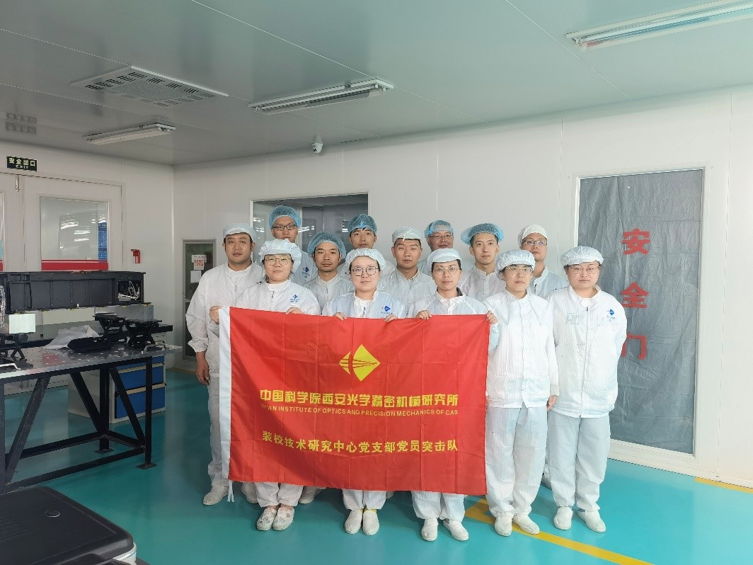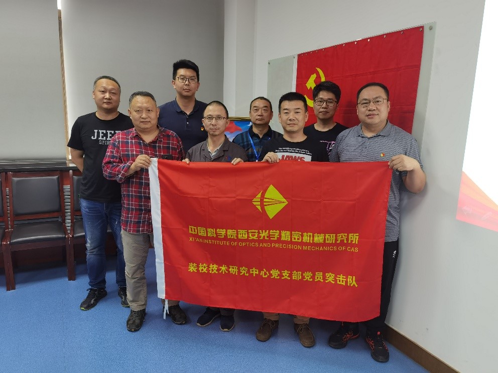 座談會后舉行了“黨員突擊隊”授旗儀式。王鋒、葛永嬌、楊洪濤、郭高、康世發等分別為空間光學裝配團隊、大口徑光學裝配團隊及精密機械裝配團隊授“黨員突擊隊”隊旗,并向廣大黨員同志發出號召:希望廣大黨員強化責任擔當,攻堅克難、吃苦奉獻,真正起到先鋒模范帶頭作用,團結帶領組內職工群眾,努力保證科研生產,以一絲不茍的態度對待產品,高質量按期完成任務。把學習黨史同推動科研工作結合起來,把學習成效轉化為工作動力和成效。